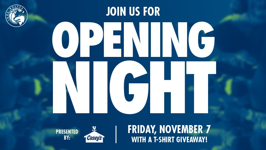 Join the Iowa Wolves for Opening Night on Friday, November 7, presented by Casey's! The first 1,500 fans will receive a t-shirt, designed by Casey's. T-shirts will be available in size large and extra large and will available at both the north and south entrances.
